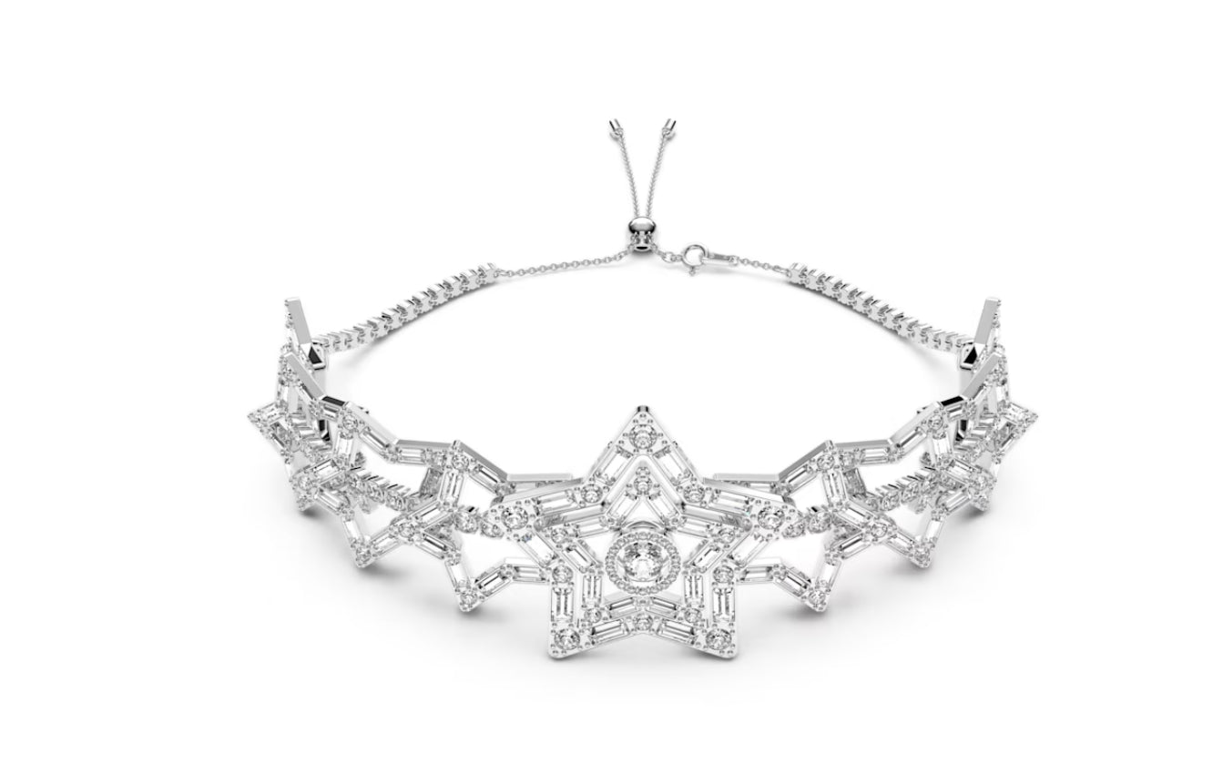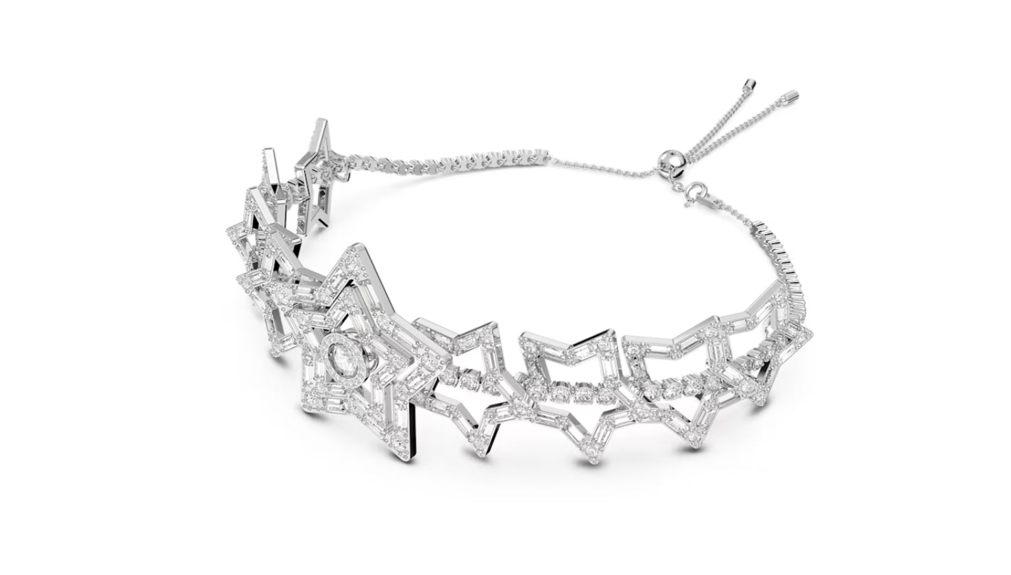 Rendi unico il tuo stile con questo choker da sogno. Un must per gli amanti delle stelle, questo choker presenta un mix accattivante di cristalli trasparenti e pietre incastonate all'interno di un'elegante montatura placcata rodio e un innovativo meccanismo con pietra ''danzante'' per un tocco dinamico. Indossalo con un abito nero per un elegante look da sera. Parte della famiglia Stella, questo choker e ideato dalla Direttrice Creativa Giovanna Engelbert per la Collection II.